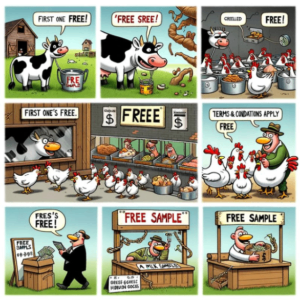 Ever thought about why cows on a farm get free food, shelter, and healthcare? Or why do chickens get free housing, medicine, and food? Even your friendly neighborhood dealer gives out free samples…