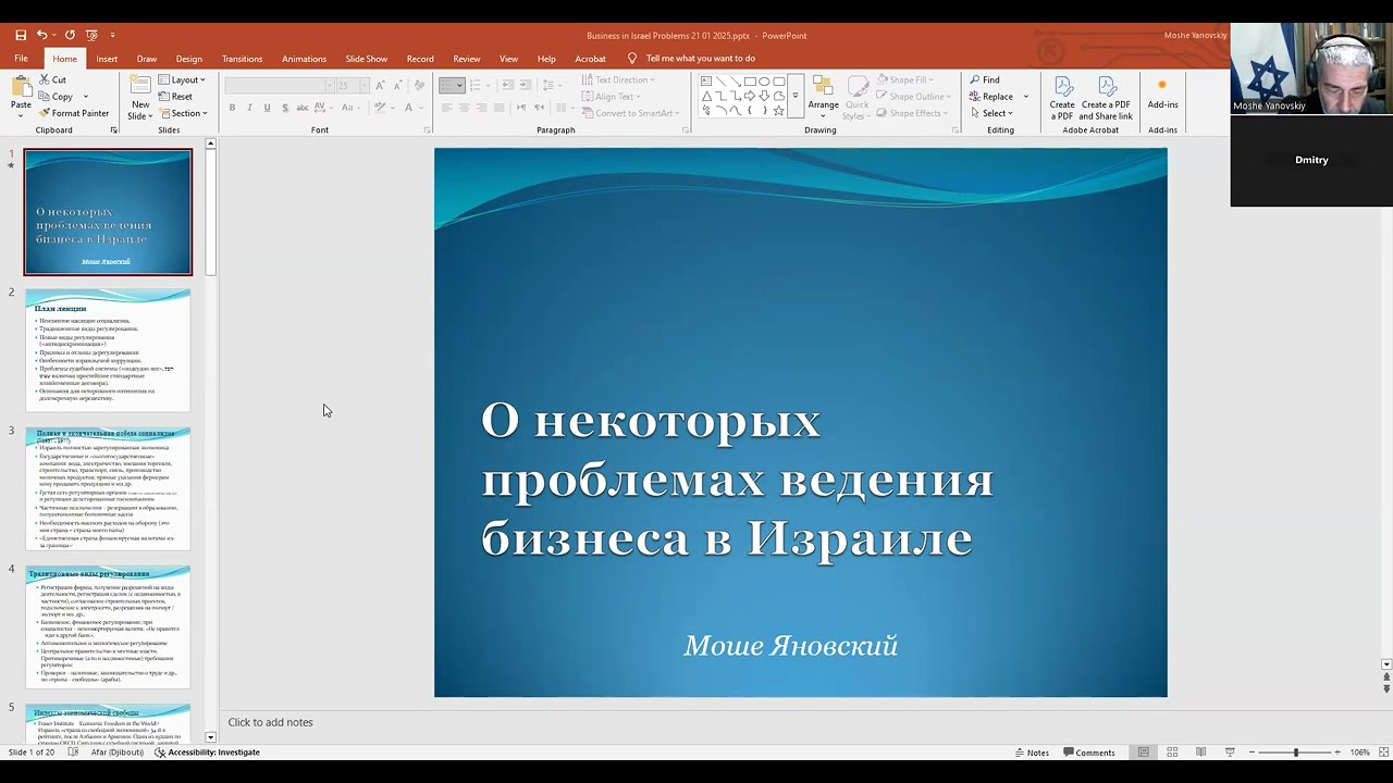 Лекция содержит обзор некоторых из наиболее тяжелых проблем создаваемых властями предпринимателям. Объясняется как провалы судебной системы ограничивают возможности реформ. Приведены факторы возможности улучшений в долгосрочной перспективе ("недостаточная" эффективность системы промывки мозгов молодому поколению и в целом более дружественное отношение его к бизнесу нежели в обществе в целом). План лекции: Неизжитое наследие социализма. Традиционные виды регулирования. Новые виды регулирования («антидискриминация») Приливы и отливы дерегулирования Особенности израильской коррупции. Проблемы судебной системы («подсудно все», הכל שפיט включая простейшие стандартные хозяйственные договора). Основания для осторожного оптимизма на долгосрочную перспективу.